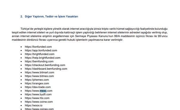 Sermaye Piyasası Kurulu, MEXC’nin Türkiye’de yasal olmayan faaliyetler yürüttüğünü belirterek erişim engeli getirdi. Ancak buna rağmen, platform Türkçe destek sağlayarak Türk yatırımcıları çekmeye devam ediyor.