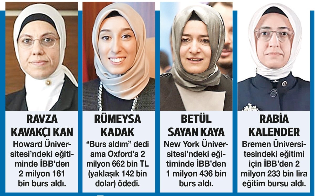 AKP Milletvekili Rümeysa Kadak, Oxford Üniversitesi’nde gördüğü yüksek lisans eğitimini tamamladığını ve burslu okuduğunu açıklamış ancak okuduğu programın en yüksek burs oranıyla dahi 2 milyon 662 bin TL olduğu ortaya çıkmıştı. Programın masrafının 121 bin sterlin olduğu açığa çıkmıştı. Bu programda tamamen burslu gibi bir seçenek yok. Öğrencilere sunulan iki burstan biri 3 milyon 674 bin TL’ye diğeri ise 2 milyon 662 bin TL’ye denk geliyor. AKP’li eski Bakan Betül Sayan Kaya, Milletvekili Ravza Kavakçı Kan ve İstanbul İl Kadın Kolları Başkanı Rabia Kalender’in de AKP döneminde İstanbul Büyükşehir Belediyesinden toplam 5 milyon 833 bin lira eğitim bursu aldıkları belirlenmişti.